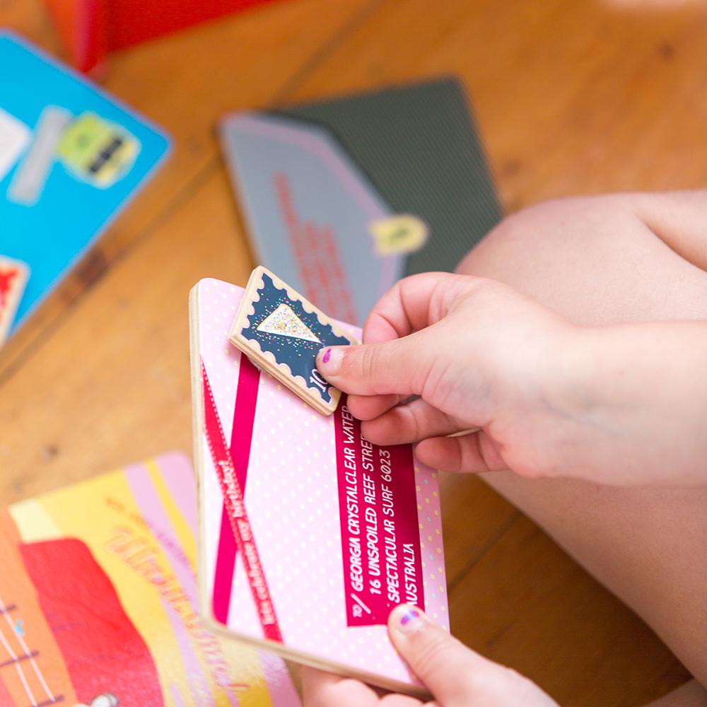 Complete with 6 wooden stamps and 6 envelopes/postcards for pretend play