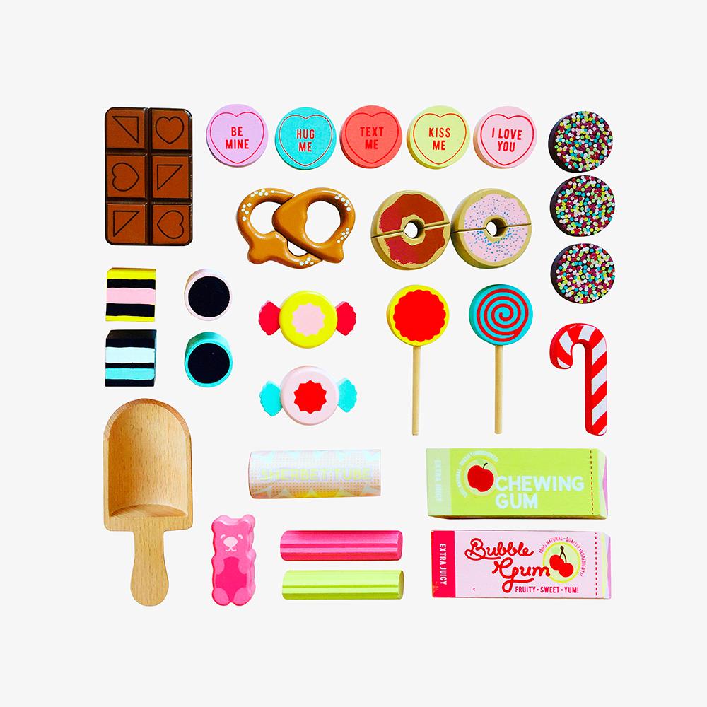 Complete with 1 x clear candy jar with wooden Lid, 2 x lolly pops, 5 x heart sweets, 2 x musk sticks, gummy bear, pretzel, candy cane, 2 x chocolate freckles, 2 x donuts, chocolate bar, 4 x liquorice pieces, 2 x wrapped lollies, sherbet tube, chewing gum packet, bubble gum packet, wooden scoop and x5 paper lolly bags for pretend play